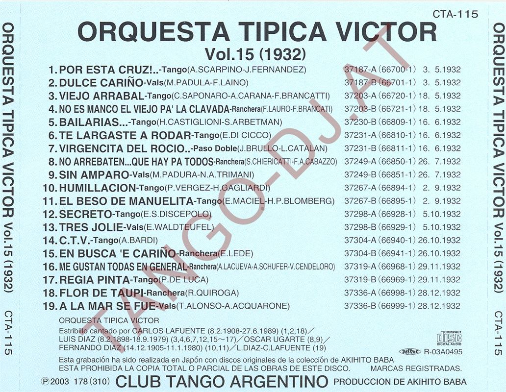 15. Cardos – Orquesta Típica Victor – 2:49 – 1931 – Tango –